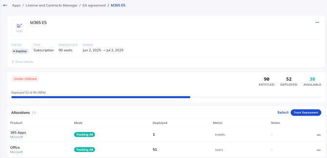 Choose the software deployment you want to allocate the license against (for example, 365 Apps or Office).