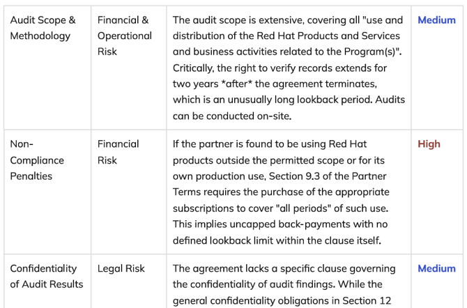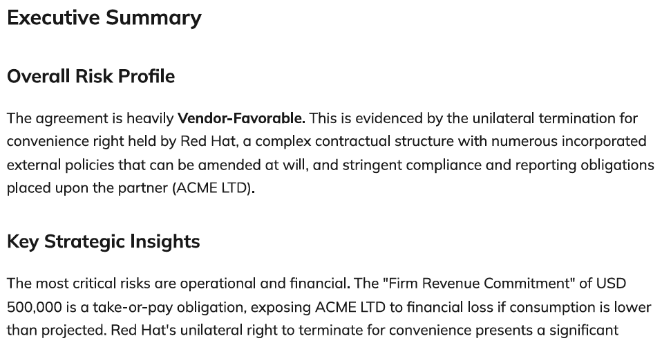 Contract Intelligence – Highlights operational, legal, and financial risks (e.g. audit rights, liability).