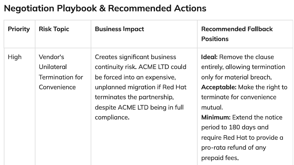 The Negotiation Playbook converts findings into clear, prioritized actions for legal and procurement teams.