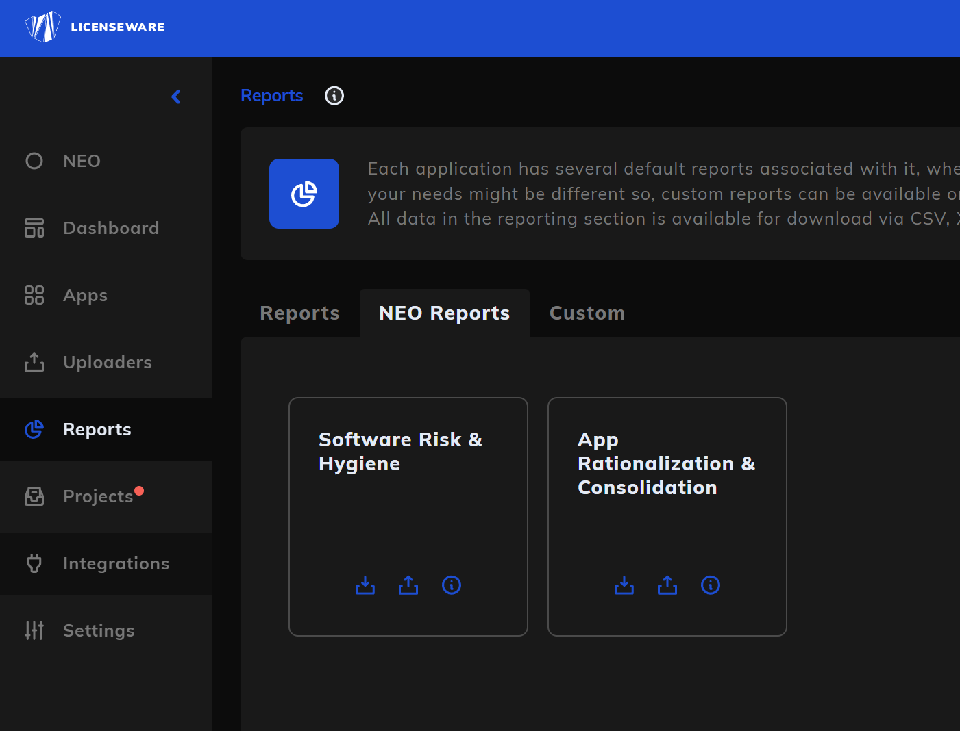 The Insights skill allows NEO to analyze the detailed reports generated by the Licenseware platform and transform complex data into clear, actionable advice in readable pdf reports.