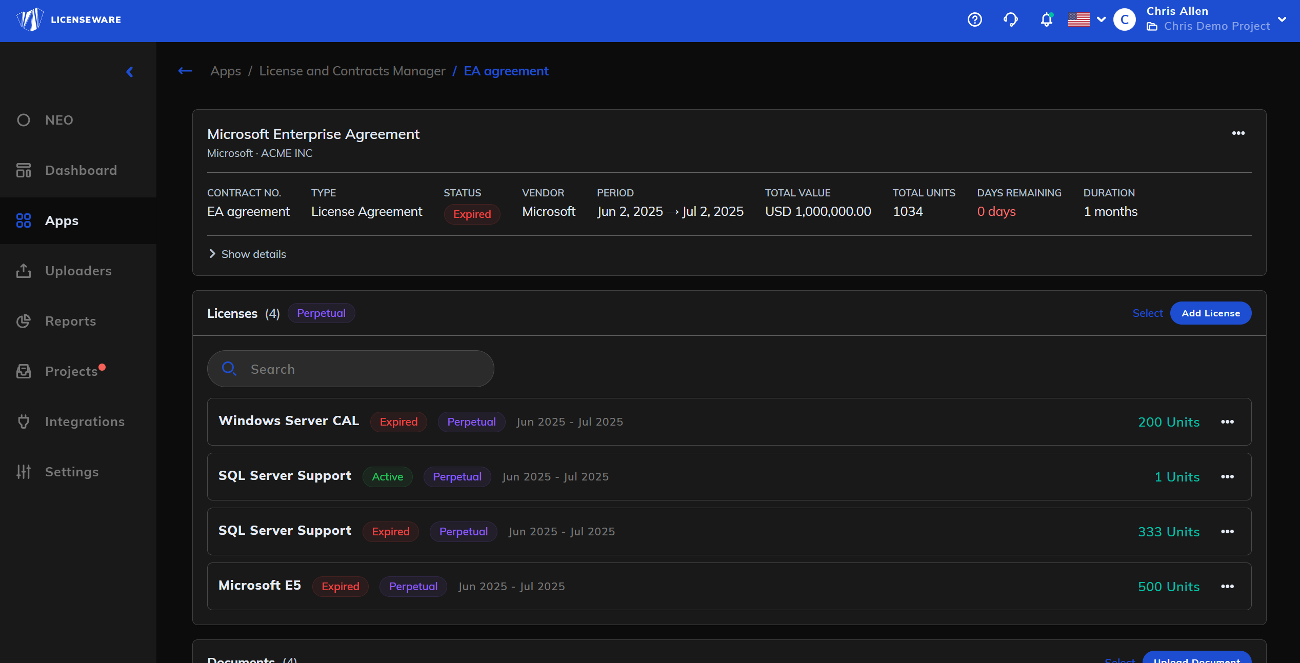 In License and Contracts Manager (LCM), you can upload supporting documents—such as license agreements, order forms, and vendor PDFs—directly to individual contracts. This ensures your contractual data and related documentation are centralized, organized, and audit-ready. OCR and AI analysis coming soon...